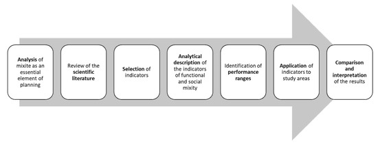 In more detail, this paper will summarize the theories and principles based on the desire to increase the sustainability of urban settlements. The results of recent research on the impacts of the urban land-use mix will be described, mainly in three fields: transportation, public health and urban economics. There is a lack of methodological analysis in the scientific literature on how best to measure the functional mix in an urban environment. For this reason, a dedicated section presents a review of various land-use mix and social mix measures, including their mathematical formulas, and discusses their conceptual and computational differences. A simulation is then carried out on some urban contexts to understand which of the identified indicators is best suited to represent the described phenomenon. Finally, the discussion of the results allows us to understand the limits and perspectives for research in this specific field of interest (Figure 1).