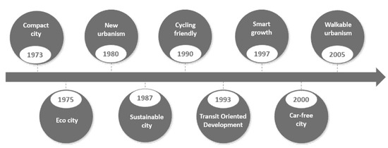 Principles and philosophies of urban planning related to the mix of land use, starting from the compact city in 1973 up to walkable urbanism in 2005 (revisited by [22]).
