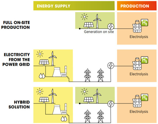 There are three production models for renewables-based hydrogen. These are full on-site production, electricity from the power grid, and a hybrid solution (Figure 2). In contrast to full on-site hydrogen production, connecting the electrolyzers to the power grid would enable the counteracting of the volatility of the wind and solar energy supply and stabilize hydrogen production.