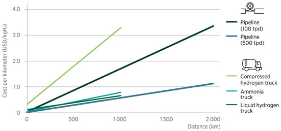 Costs for hydrogen transport as a function of distance by selected transport mode. Source: IRENA (2021) [27].