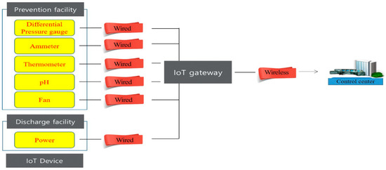 Data transmission from the IOT devices installed in the discharge and prevention facilities to the IOT management system (wired) [31].