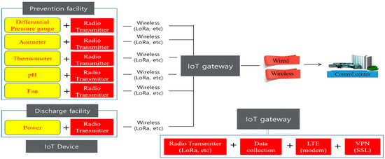 The IoT remote management system was applied to collect the measured data from various instruments installed in the discharge facilities and prevention facilities on the IoT Gateway (data collection device) and transmit them to the IoT management system through VPN (security device) using the Internet.