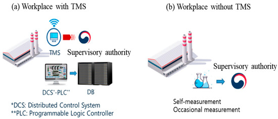 In Korea, pollutant emission facilities in workplaces are monitored differently for workplaces with and without TMS (Figure 3). For workplaces with TMS (Figure 3a), pollutants are monitored in real time (usually every 5 min with a slight difference depending on the pollutant type), making it easy to manage the operating status of the emission and prevention facilities. Therefore, data on pollutant emissions, electrical energy, flow rate, and pressure are managed in a database.