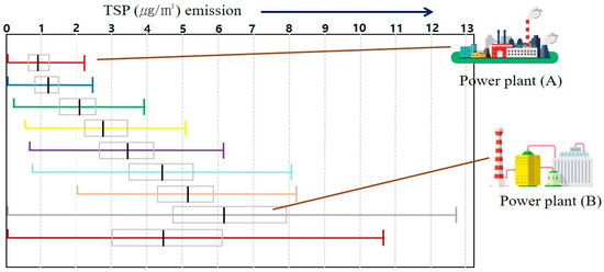 For power plant A, the TSP emission concentration was stable at a very low level (1 mg/m3). However, in power plant B, the average TSP emission concentration was high, with a wide range.
