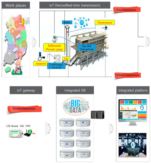 Some authors [28,29,30] have already devised concepts in, and shown the results of, monitoring management using IOT sensors related to industrial facilities. However, it is difficult to find cases of environmental management that investigate the operating factors throughout the emission and prevention facilities of a workplace and that monitor the indirect management factors in real time by installing IOT instruments.