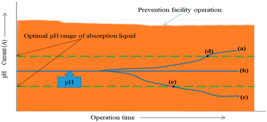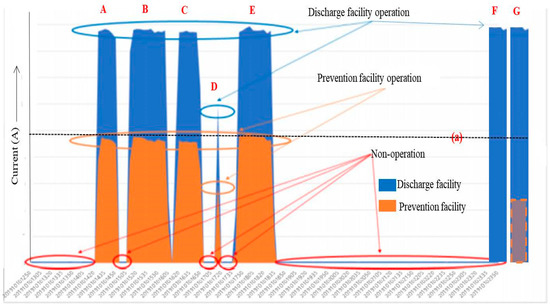 Figure 6 shows a case of monitoring the operation of the pollutant emission and prevention facilities for 24 h through current measurement [36]. Graphs A, B, C, and E exhibit similar current consumptions because the pollutant emission facility had similar operating levels. Therefore, the pollutant prevention facility also exhibited similar (Line (a)) current consumptions. If the operating level of the pollutant emission facility decreases due to a reduction in production, the current consumption of the pollutant emission facility drops below Line (a) and that of the pollutant prevention facility also decreases, as shown in Graph D.