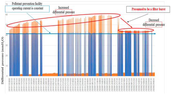 Regarding the differential pressure reduction due to a filter burst and the normal differential pressure range in various industries, the results of a survey conducted by the Korea Environment Corporation (K-eco) were cited [31].