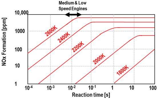 The generation of thermal NOx is closely affected by the reaction temperature. In other words, it is significantly affected by the combustion chamber temperature, and thermal NOx is generated in large quantities when the temperature is high and the residence time of the combustion gas in the high temperature region is long. According to the Zeldovich theory, the generation of thermal NOx is highly sensitive at a reaction temperature between 3000 and 6000 °F (1650–1980 °C), and more thermal NOx is generated as the high-temperature region ≥1300 °C increases. Takasaki et al. also reported that the emission concentration of NOx increased as the combustion temperature increased, and it was also affected by the reaction time, as shown in Figure 9 [42].