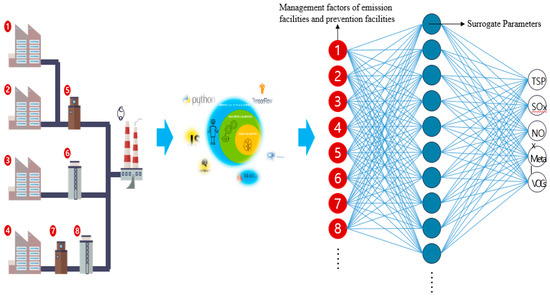 The workplace operates each emission facility and prevention facility under the appropriate operating conditions. The appropriate operating conditions are represented by operating factors 1 to 8 in Figure 10 [44]. However, these operating factors are appropriate operating conditions in the independent aspects of each facility. Independent aspects of each facility mean minimizing the use of raw materials or auxiliary materials, reducing energy and water consumption, and increasing efficiency. However, the surrogate parameters mentioned in Figure 10 refer to management factors that are comprehensively considered to maintain the emission concentration of environmental pollutants within or below the emission limit, as well as the appropriate operation in the independent aspect of each facility. Surrogate parameters are also management factors that can be easily monitored by installing IOT instruments.
