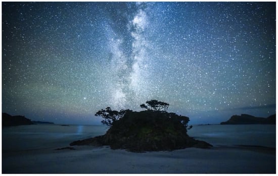 For its small population, land mass, and isolated location, New Zealand has a high number of astronomical observatories [1]. It also has four officially confirmed International Dark-Sky Association’s (IDA) Dark-Sky Places [2,3,4,5]: the Aoraki Mackenzie International Dark-Sky Reserve (Figure 1), Aotea/Great Barrier Island Dark Sky Sanctuary (Figure 2), Rakiura/Stewart Island Dark Sky Sanctuary (Figure 3), and the Wai-iti Recreational Reserve and Tunnicliff Forest Dark Sky Park, with another 18 places currently aspiring to become recognised dark sky destinations [6].