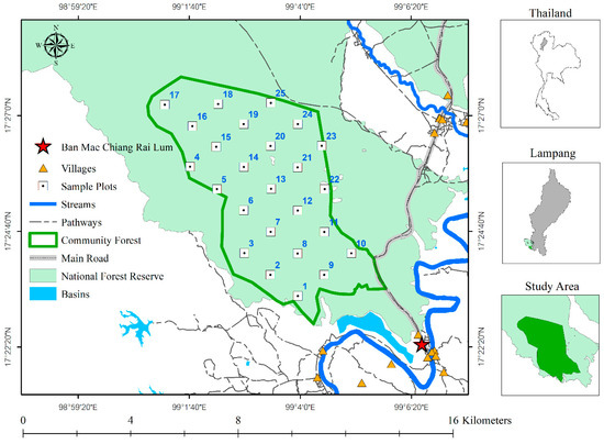 This study was conducted in the Ban Mae Chiang Rai Lum Community Forest (17°22′48″ N to 17°27′47″ N and 99°00′47″ E to 99°05′48″ E) which is part of the Pa Mae Phrik National Forest Reserve of Lampang Province in northern Thailand. The study area is one of the largest community forests in Thailand with an area of 3925 ha. It ranges in altitude from 140 to 660 m and has been classified as a deciduous forest [48] (Figure 1).