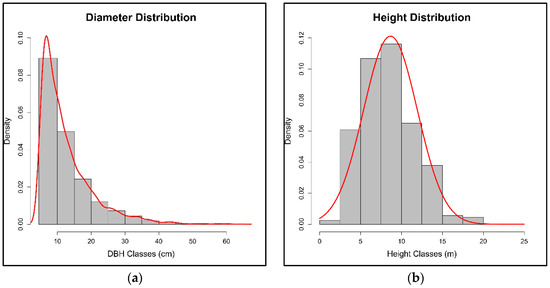 Distribution of trees according to: (a) DBH class and (b) height class within the community forest.