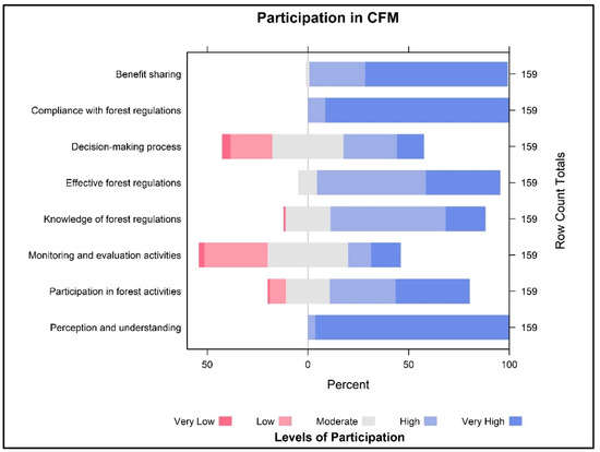 There are four components of CFM: (1) the level of participation in management efforts, (2) knowledge of regulations and opinions as to the levels of compliance with, and the effectiveness of, those regulations, (3) understanding and perception of CFM, and (4) the sharing of forest resource benefits [25,56,57,58,59]. Investigating these components can help us assess the effectiveness of CFM.