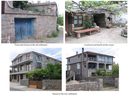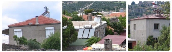 The new residential area is lower down the hill. The houses are usually two or more stories in height. The plots are mostly rectangular or square and are larger (90–120 m2) than the plots in the old settlement. Although there are some houses built with traditional methods in the village’s new settlement, new buildings and extensions for traditional houses have been built with contemporary construction methods and materials in recent years (Figure 3). New houses have more and larger openings (the window to wall ratio is 30–45%) without shading devices, making it difficult to control solar heat gains or losses and to conserve energy. Most of the houses have pitched roofs with terracotta tiles. Unlike the traditional courtyards, the gardens are used mostly for planting edible gardens, not for daily life activities. Since visual privacy is not required, the new houses do not have high courtyard walls, and instead they have terraces or balconies.