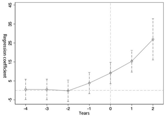 After reanalyzing the samples following propensity score matching, there is no significant difference in symbol, significance level, and coefficient value between the results in Table 3 and Table 5, which shows that the estimation results in this paper are robust. At the same time, the estimated coefficient of the treat × post of each column in Table 5 has decreased compared with Table 3, indicating that the analysis results after propensity score matching avoid overestimating the policy effect and present more accurate estimation results.