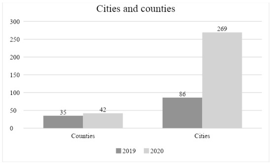 Figure 1 shows how the coverage of the application has evolved from 2019, before the COVID-19 pandemic, until 2020, during the pandemic. In 2019, 35 out of 42 counties had at least one city enrolled in the platform, while in 2020, the application gained full coverage over Romania in terms of counties. Moreover, in 2019, 87 different cities were enrolled, and this number grew in 2020 to 258, an increase of almost 300% compared to 2019.