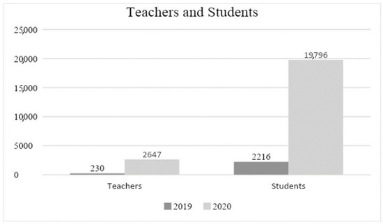 Figure 2 shows the evolution of the number of teachers and students during the pandemic. As can be seen, in 2019 there were 230 teachers and 2216 students enrolled, and in 2020 the number of teachers grew almost twelve times to 2647, while the number of students grew almost nine times to 19,796.