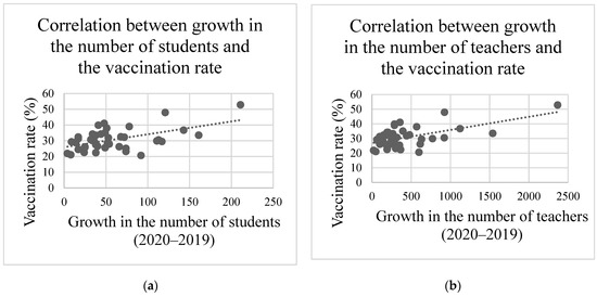 (a) Correlation between growth in the number of teachers and the vaccination rate; (b) Correlation between growth in the number of students and the vaccination rate.