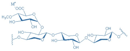 Xylan polysaccharides are the most abundant hemicelluloses component of hardwood, available in large quantities in secondary cell walls of agro-residues (wheat straw, corn stalks, and cobs) or as secondary products in the wood or pulp and paper industry [,,]. A new source of xylan biopolymers includes some types of seaweed (green and red algae) []. In biomass, xylans can be found with various structures based on their botanical source or tissue type. In annual plants and algae, xylans are heteropolymers based on a 1,4-β-D-xylopyranose backbone, which is branched by short carbohydrate chains. However, certain green and red algae contain 1,3-β-D-xylans or 1,3;1,4-β-D-xylans, which are homoxylans [,].