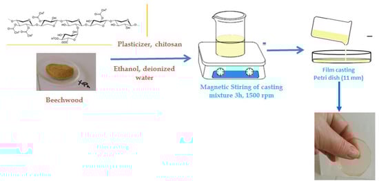 Four series of films (Table 1) were prepared by the casting method. Xylan, plasticiser, and chitosan were dispersed in deionised water (1%) and ethanol under magnetic stirring at 1500 rpm and room temperature for 3 h; subsequently, the mixture was cast in a Petri dish (11 cm in diameter) and dried at the laboratory temperature for 4 days (Figure 2).