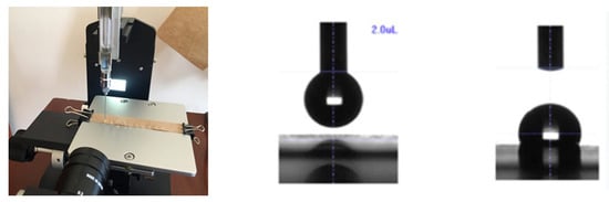 CA tests were performed by the sessile drop method, according to the TAPPI T 458 cm-04 standard (2004), using a Kyowa goniometer, Model DM-CE1, equipped with a digital camera and software for recording and processing results. Paper samples were fixed with clamps on the goniometer test table, and then water drops were deposited on its surface with a microsyringe. The value of the contact angle was recorded after a water–substrate contact time of 5 s on samples. A total of 10 measurements were taken for each sample (Figure 3).