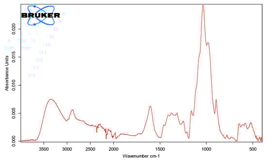 The FTIR spectra were recorded with a solvent-free Bruker Invenio spectrometer, with a horizontal attenuated reflective device (ATR) equipped with diamond crystal, on a spectral window between 400 and 4000 cm−1, scan no. = 32 (sample/background), and a resolution of 4 cm−1. No prior preparation of samples was required for spectrum recording. A computer, Model OPUS 8.2.8, was used for spectrum recording.