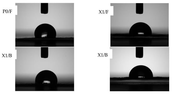 Images of water drop on the coated paper samples surface. P0, base paper; X1, xylan-coated paper sample; F/B, front side/backside of sample.