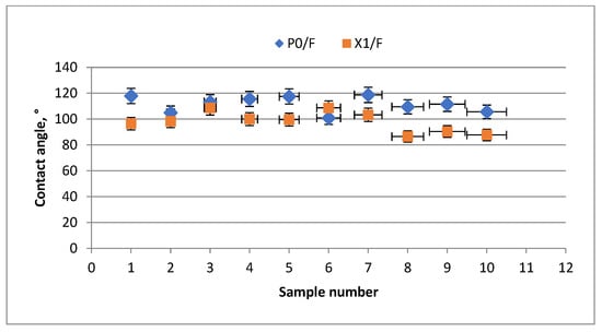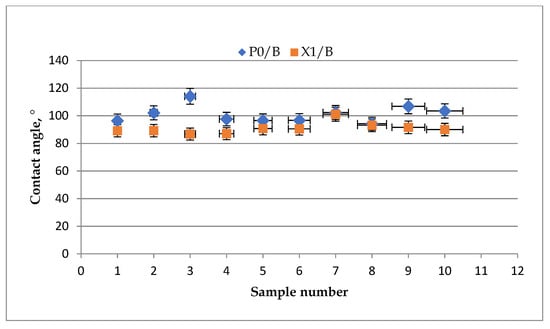 Analysing the results presented in Figure 6, Figure 7 and Figure 8, it can be seen that the contact angle values for xylan-coated paper samples do not vary significantly, compared with the paper substrate. The value of water absorption for the base paper indicates that this substrate is medium sized. This limits the penetration of xylan dispersion within a fibrous network. As a result, a higher amount of xylan polymer remains at the paper surface which is hydrophilic and hydrosoluble []. In this case, the contact angle of the coated samples is influenced by the nature of the coating layer only.