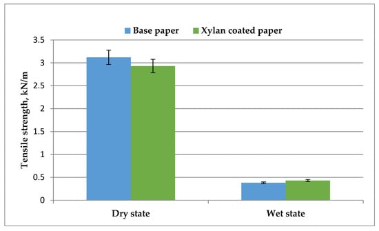 In addition to functional properties, mechanical strength is very important for paper packaging to assure the appropriate protection of the packaged material during transport and handling. Moreover, for papers that will be used under wet conditions, high wet strength is preferred. The wet strength of the samples is expressed in terms of the wet/dry strength ratio, which is the wet tensile strength expressed as a percentage of dry tensile strength. Analysing the obtained results (Figure 9), it is observed an insignificant increase in the wet tensile strength of xylan-coated papers, in comparison with the base paper. This suggests that hydrogen bondings are still the predominant basis of the structure []. The decrease in dry tensile strength of xylan-coated papers may be suspected by the fact that xylan has lower mechanical strength than the paper substrate, which would lead to a decrease in tensile strength in the combined material. It is also possible that the xylan coating interferes with the hydrogen bond network, which reduces the tensile strength of the base paper as well.
