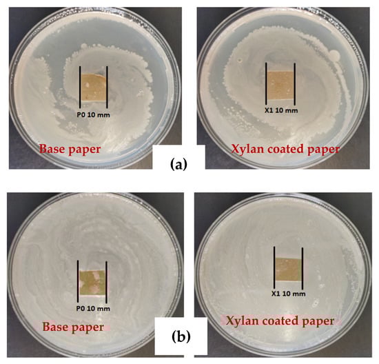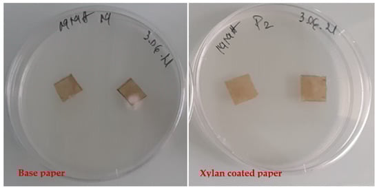 Inhibition zone is the most-used method for antimicrobial activity tests of materials. By using this method, bacterial growth is inhibited by the formation of a transparent zone resulting from the diffusion of antimicrobial agents in agar plates. As can be observed in Figure 10, there is no inhibition zone around the paper piece, for both base paper and coated samples with xylan hemicellulose.