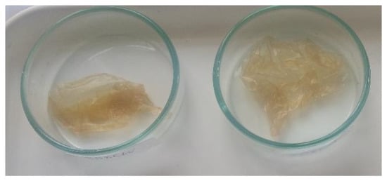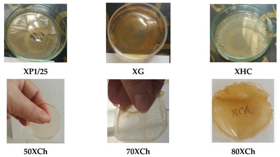 It is important to mention that, in the swollen state, films with xylan and chitosan preserved their integrity, i.e., they were easily handled (Figure 13). This is beneficial for predicting their potential application for hydrogels and packaging purposes.