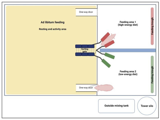 The resting/activity area was built with pen construction elements and had alternating perforated and paved areas. This functional area contained the drinkers and centrally the access to the feeding areas through a sorting gate (Hölscher + Leuschner GmbH & Co. KG®, Emsbüren, Germany). The sorting gate separated the feeding area from the activity and resting area (Figure 3).