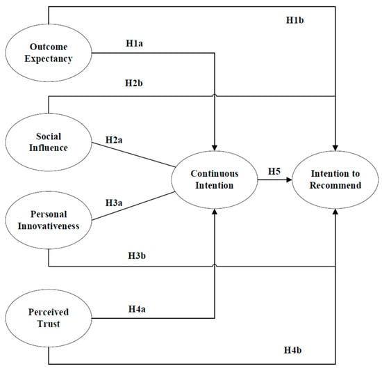 Reference [66] found a direct relationship between perceived trust and the intention to continue using social networking sites such as Facebook. A similar direct and significant relationship between perceived trust and usage continuance intention was also found by [67] in the context of web-based online banking services. Reference [68] found that customer trust is positively associated with consumers’ intention to continue using mobile payment systems in China. Moreover, the correlation between perceived trust and intention to recommend or positive WOM can also be found in the literature. For example, ref. [69], while examining the effects of perceived justice on recovery satisfaction, trust, WOM and revisit intention in an upscale hotel, found that trust is positively associated with WOM and revisit intention. Given these significant findings, we formulated the hypotheses shown below.
