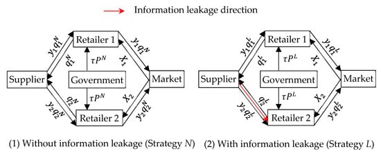 From Figure 2, we can see that the supplier is the leader in the vertical Stackelberg game, and the corresponding two retailers are the followers. In addition, when the supplier leaks retailer 1′s order quantity to retailer 2, the two retailers form a horizontal Stackelberg game with retailer 1 as the leader and retailer 2 as the follower.