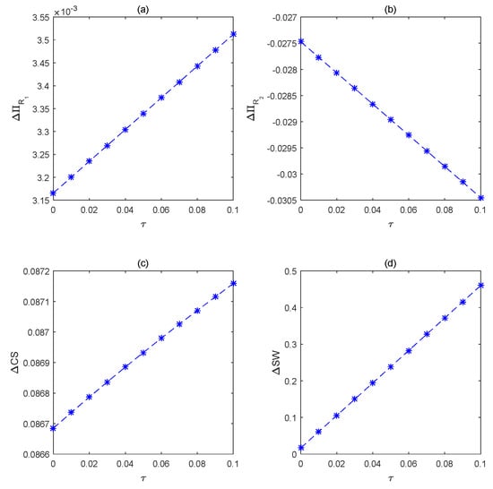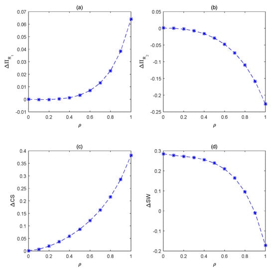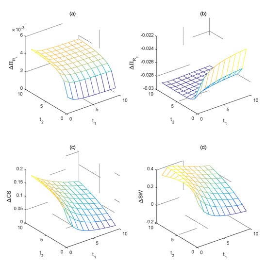 From Figure 3a,c,d, we can see that , and are always positive. Figure 3b shows that is negative. This indicates that retailer 1 benefits from the supplier’s information leakage behavior, while retailer 2 suffers from the supplier’s information leakage behavior. In addition, the supplier’s information leakage behavior enhances both the consumer surplus and social welfare.