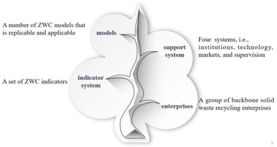 At present, there is no universal definition of the concept of ZWC [,,]. Zaman and Lehmann conceptualized ZWC as entailing a 100% rate of recycling and recovery of all resources from waste materials []. The idea of ZWC is similar to that of circular economy (CE). Both propose that the resources extracted and produced be kept in a cyclical flow [,,,,,]. The close-cycle material flow based on nature’s no-waste principles is applied in the zero-waste system, which also promotes circular economy [,]. These concepts promote the adoption of closing-the-loop production patterns to increase the efficiency of resource use and reduce landfill of solid waste, to achieve a better balance and harmony between economy, environment and society [,,,,,,,]. Circular economy practices were examined widely in developed countries in North America, Europe [,,,], and East Asia []. For instance, Japan started to build a recycling society in 2000, The European Commission launched “Towards a circular economy: A zero waste program for Europe” in 2014, and Singapore put forward its national vision of zero waste in 2015. In fact, developed countries regard CE as a specific and key measure to achieve the goal of zero waste.