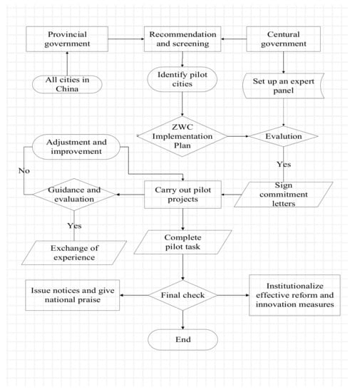 The pilot cities were recommended by the relevant provincial departments and determined by MEE in conjunction with the relevant national departments. The procedures and steps to build ZWC are illustrated in Figure 2. The selected pilot cities were required to compile the implementation plan for the construction of ZWCs, determine pilot objectives and task lists, divide tasks and allocate them to various departments, and define the detailed work to be accomplished within each time period. MEE set up an expert committee on ZWC to review the implementation plan of each pilot city, and the approved plans were printed and implemented. MEE selected 11 pilot cities, listed in Table 2. In addition, the Xiongan New Area Hebei, Beijing Economic and Technological Development Zone, Sino-Singapore Eco-City, Guangze county in Fujian province, and Ruijin city in Jiangxi province were selected as special regions to be promoted in the context of ZWC construction. Pilot cities and regions proceeded with construction tasks in accordance with the approved implementation plans.