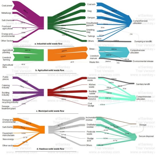 The data of eight indicators for evaluating the ISW management performance are listed in Table 3, and material flow of industrial solid waste is shown in Figure 4. The dominating industries in Xuzhou were power plants and coal mining. Correspondingly, fly ash, slag and coal gangue accounted for 27.2%, 21.6% and 21.2% of the total solid wastes, respectively. Therefore, it is necessary to implement waste reduction in the whole-process industrial chain in power plants and coal mining, so as to better reduce the generation of solid waste.