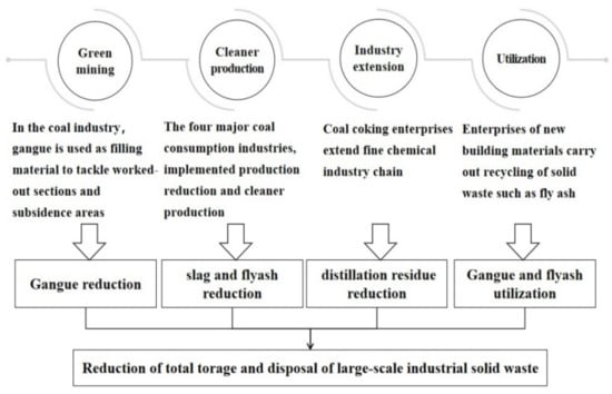 Waste reduction along the industrial chain is aimed at promoting zero growth in the total storage and disposal of large-scale industrial solid waste (ISW) through the incorporation of waste-reduction technology in all the links of the industrial chain. To achieve this goal, filling technologies will be adopted in mineral industries, and solid waste will be promoted in the mining industry to produce construction materials or address subsidence areas. Second, green design and green supply-chain management will be vigorously promoted to improve product detachability and recyclability. Third, categories of technical standards will be formulated for industrial byproducts and comprehensive utilization products, with a focus on tailings, coal gangue, fly ash, smelting slag, industrial byproduct gypsum, etc., to promote the utilization of large-scale ISW as resources.