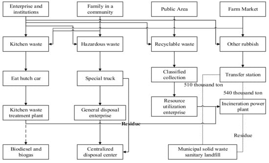 Improper management of MSW through open burning, open dumping, and unsanitary landfilling contributes to many environmental problems, such as global warming, ozone depletion, human health hazards, ecosystem damages, and abiotic resource depletion [,,]. As the world’s largest MSW generator, China generated around 242.062 million tons of MSW in 2019, up 6.16% year on year. China is deeply troubled by the “garbage Siege”, lacking in inadequate collection, classification, and disposal systems for MSW. The generated waste is not fully collected in some urban and rural joint areas, due to the limited collecting ability of the related government department. Therefore, source classification and collaborative utilization of MSW has been proposed to ensure that MSW is strictly classified and all kinds of waste are utilized in a coordinated manner to improve the utilization rate of waste resources and reduce environmental pollution. In addition, water separation relied on the buoyant and the sink force of water, and mechanical separation relied on size sorting and mechanical rules are adopted to supplement mixed MSW classification.