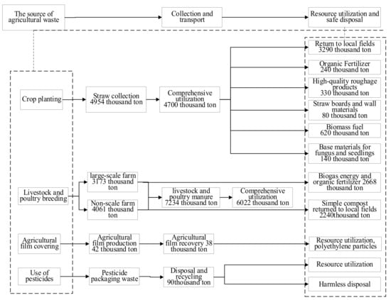 The improper disposal of agricultural waste leads to the generation of large quantities of N2O, SO2, CH4, and smoke, and the deterioration of soil and water at the regional scale [,,,,]. Therefore, the importance of establishing an alternative method to improve the environmental conditions cannot be neglected. The concept of multichannel resource utilization of agricultural waste entails the adoption of various green agricultural technologies, such as cyclic development mechanisms for planting and breeding, and energy utilization, to realize the full utilization of agricultural waste.