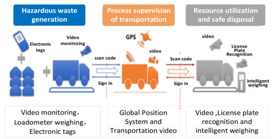 Xuzhou has established a supervision system for the generation, storage, transfer, utilization, and disposal of hazardous waste, which is shown in Figure 8. The enterprises concerned use loadometers to regularly weigh the hazardous waste produced and attach a distinguishing mark and electronic labels to the packaging containers to identify the type and production volume. The combined hazardous waste transfer form and electronic tag scanning code are supplied to the transportation vehicles, which are equipped with global positioning systems and on-board videos for positioning and monitoring. The hazardous waste disposal enterprise, which obtains its license only after its disposal technology meets the standards as verified by the environmental protection department, checks the waste information of the transportation vehicles through electronic tag scanning, video monitoring, and license plate recognition systems to ensure that the hazardous waste indeed originated from the enterprise specified and is finally disposed of safely. In 2020, the safe disposal ratio of hazardous waste and coverage ratio of medical waste collection and disposal system was 100%, and the pass rate for standardized management of hazardous waste was 97.3%, which indicates little illegal diversion or dumping of hazardous waste. Similarly, Kunming has adopted a strict hazardous waste management strategy since December 2019, that is, control of the whole process of hazardous waste generation, transfer and disposal has been implemented, and the utilization rate of industrial hazardous waste disposal reached 94.4%.