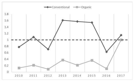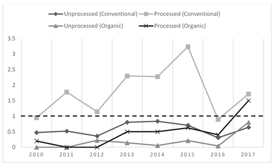 In performing a comparative analysis between unprocessed and processed food products in both conventional and organic production, we used similar D/P ratios (as described above). The results are shown in Figure 3.