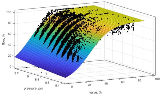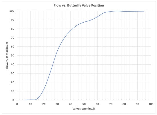 As it was shown in Figure 1, the relationship between the disc position and flow is nonlinear. To address valves’ non-linearity, many researchers [,,,,,,] proposed to use the first principle approach for valve modeling. Tang et al. [] used a semi-empirical approach to model pneumatic valves’ characteristics. Jeon et al. [] and Del Toro [] successfully used computational fluid dynamics for valve modeling. Recently, machine learning started to be utilized for valve modeling. For example, Obonrkale et al. [] used linear regression to predict cavitation in the valves. Balu et al. [] used deep learning for valve analysis. Khalid et al. [] used a support vector machine to detect valve stiction.