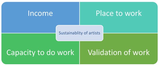 From the study, there are four important issues that need to be addressed when considering how the work of artists can be sustainable. These issues are enhanced when considering the conditions of a pandemic. These can be summarized as a regular income, a place to work, a capacity to do work (relating to both the mental and the emotional factors, as well to time), and a validation of the artist’s work. If all these factors are in place, then the artists can continue to do their work sustainably. Without even one of these factors in place, the sustainability of the artist comes under pressure. This is expressed in Figure 1 below.