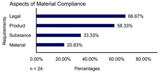The provided answers concerning the participants understanding of MC were quantified using a content analysis. Four categories were derived from the answer material representing different aspects of the understanding of MC: adherence to legal requirements (legal) and adherence to requirements concerning products (product), substances (substance) or materials (material). For several answers, more than one of these aspects were assigned. The results illustrated in Figure 4 show that the majority of participants understood MC as adherence to legal requirements (66.67%) and requirements concerning products (58.33%), while a large part further included adherence to requirements concerning substances (33.33%) and materials (20.83%).