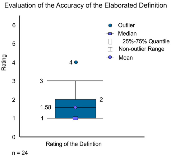 This is further supported by the rating results of the elaborated definition, which participants rated on a scale from 1 (accurate) to 6 (not accurate). The results illustrated in Figure 5 show that the participants generally considered the elaborated definition accurate as the values ranged between 1 and 4 (1 and 3 when excluding the outlier). Thus, none of the participants rejected the definition entirely, and half of the participants provided a positive rating by selecting categories 1 or 2. On average, participants rated the definition with 1.58 (mean). The standard deviation was 0.93, and the median was 1.