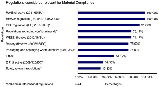 To provide further insights into the understanding of MC, it was analyzed which regulations participants considered relevant for MC. The results illustrated in Figure 6 show that the participants considered all listed regulations as relevant, primarily the RoHS directive (2011/65/EU) and the REACH regulation ((EC) No 1907/2006) (100%), followed by the regulation (EU) 2019/2021 (Persistent Organic Pollutants (POP) regulation) (91.67%), regulations regarding conflict minerals and directive 2012/19/EU (Waste Electrical and Electronic Equipment (WEEE) directive) (79.17%). While 54.17% of the participants chose to add other regulations, this number is compromised by the fact that several participants added regulations that were already included in the answer categories as similar international regulations, or participants added requirements which could not be considered as regulations, e.g., customer-specific requirements. Thus, only 12.5% of the participants added regulations not previously included in the answer categories.