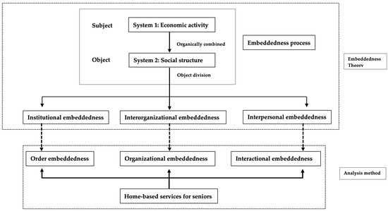In terms of case, the investigations focused on the socio-economic attributes of seniors and the demands and supplies of community services. Due to the communication habits of the elderly and the chronic disease of some interviewees, this study adopted face-to-face interviews and questionnaires to conduct the survey. Overall, 100 unstructured and semi-structured interviews were conducted. Where possible, we had conversations with the staff of neighbourhood organisations. It is important to emphasise that triangulation of conversations has become possible because of interests in ongoing research on the social space of community at the micro level, and this survey tended to use cross-sectional methods. We believed that this longitudinal approach helps to uncover long-term trends. In this study, institutional embeddedness refers to the integration of economic behaviour into the order of a social system. Interorganisational embeddedness refers to integrate economic activities into strategic alliances and organisational mechanism. Interpersonal embeddedness refers to multiple social relations embedded in the neighbourhood organisations that conduct economic activities, as well as the impact of social spaces on the identity, interests, capabilities, and practices of the elderly (see Figure 1). We attempted to relate three dimensions of social relations to institutions, community services, and interactions of seniors.