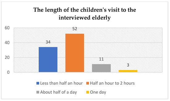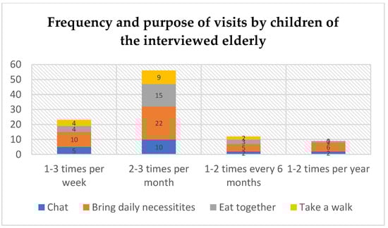 In order to explore whether the interorganisational embeddedness can fill the care services needed by elderly residents, we conducted the analysis of the connection between the elderly people and their families to help us to verify to what extent the return of the government can activate the role of market instruments. More significantly, analysing the frequency of contact between children and the interviewed elderly people helped us understand how the state has filled the vacuum in privatised services and changed it into a process of a state-organised system. In Figure 5, Figure 6 and Figure 7, it can be seen that the frequency of children’s visits to the elderly’s home was irregular, mostly two to three times a month, with a short stay each time. The visiting usually takes only about half an hour to an hour. The purpose of the visit was also largely limited to providing economic and supplies support. Most children brought food and daily necessities to the elderly. “The visiting is not very regular, basically once per month, with 3 children adding up to once to twice a month” (an elderly female B, 15 May 2021). “My oldest son lives in Jiangning (a new town in Nanjing), and he used to come to see me once a month, but now his wife is pregnant, and he seldom comes” (an elderly female C, 15 May 2021). “The purpose of my daughter’s visit is to bring some daily necessities. She usually only stays for half an hour and then leaves. In fact, I really hope she can stay longer to chat with me” (an elderly male C, 15 May 2021). “Instead, Xiao Wang (the pseudonym of a carer) is the one I talk to most. He talks about topics I care about” (an elderly male D, 15 May 2021). The complete separation of the living spaces between the elderly and their children leads to a misalignment of their priorities, which, combined with the increased cost of commuting, has ultimately led to a decline in intimacy and family relations between the elderly people and their children. In the case of alienated family relations, the children often have a misplaced perception of the psychological needs of their parents, that is, they attempt to express their filial piety through financial support.